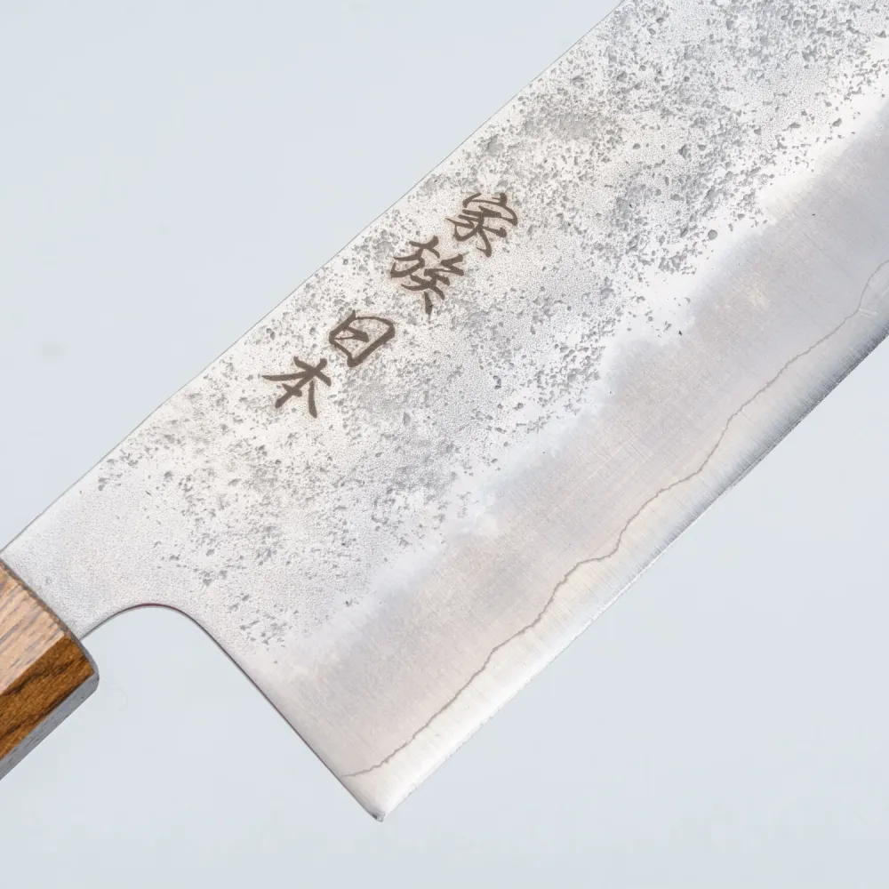 Das aus hochwertigem rostfreiem Ginsan-Stahl (Silber 3) gefertigte Kazoku Ginsan Nakiri bietet die Schneidleistung von Kohlenstoffstahl und ist gleichzeitig so pflegeleicht wie Edelstahl. Mit einer Härte von 61 HRC ist dieses Messer sehr langlebig und behält seine scharfe Schneide auch bei intensivem Gebrauch. Das Nashiji-Finish, benannt nach der rauen Textur einer japanischen Birne, verhindert das Anhaften von Lebensmitteln an der Klinge und macht jouw Vorbereitungsarbeiten reibungsloser und effizienter.