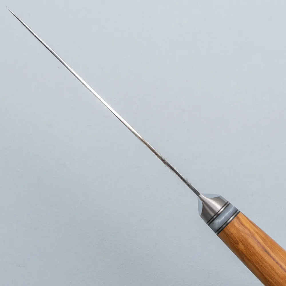 Der Griff aus Olivenholz verleiht diesem Messer seinen Charakter. Jeder Griff hat eine einzigartige Maserung, die jedes Stück ein wenig anders macht. Er liegt warm und bequem in der Hand, während er gleichzeitig das Gleichgewicht und die Stabilität während des Gebrauchs bewahrt.