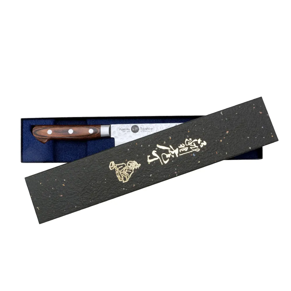 Das Kazoku Takahiro Messerset 2-teilig bietet die perfekte Kombination aus einem Kochmesser und einem Gemüsemesser, die beide für außergewöhnliche Leistung zu einem unglaublich günstigen Preis gefertigt wurden. Das 21 cm lange Kochmesser ist vielseitig genug für eine breite Palette von Aufgaben, vom Hacken und Schneiden von Fleisch bis hin zum feinen Zerkleinern von Gemüse. In Kombination mit dem 13,5 cm langen Gemüsemesser ist dieses Set ideal für kleinere Zutaten und präzise Schnitte und damit ein Muss für jede Küche.