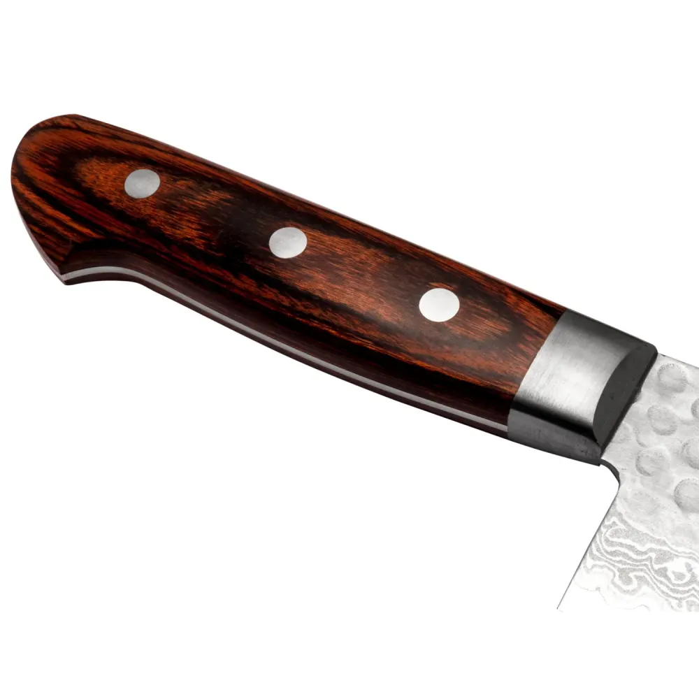 Die Takahiro-Messer sind aus japanischem VG-10-Stahl gefertigt, der für seine überragende Schärfe und lang anhaltende Schnitthaltigkeit bekannt ist, und ermöglichen müheloses Schneiden. Die Klinge wird durch mehrere Lagen Damaststahl noch haltbarer gemacht, die den harten VG-10-Kern schützen und die Ästhetik des Messers unterstreichen. Die Tsuchime-Beschichtung, ein gehämmertes Muster, das die Reibung verringert, erhöht die Leistung zusätzlich, da es verhindert, dass Lebensmittel an der Klinge haften bleiben.