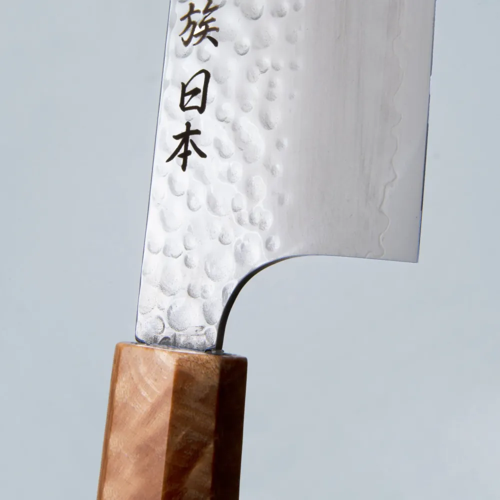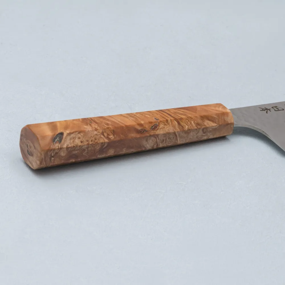Die Klinge ist mit einer handgehämmerten Tsuchime-Beschichtung versehen, die dem Messer Charakter verleiht und das Anhaften von Lebensmitteln verringert. Die Klinge wird durch einen eleganten achteckigen Griff aus gelbem Wurzelholz ergänzt, der sich ergonomisch verjüngt, um Komfort und Kontrolle beim Gebrauch zu gewährleisten.
