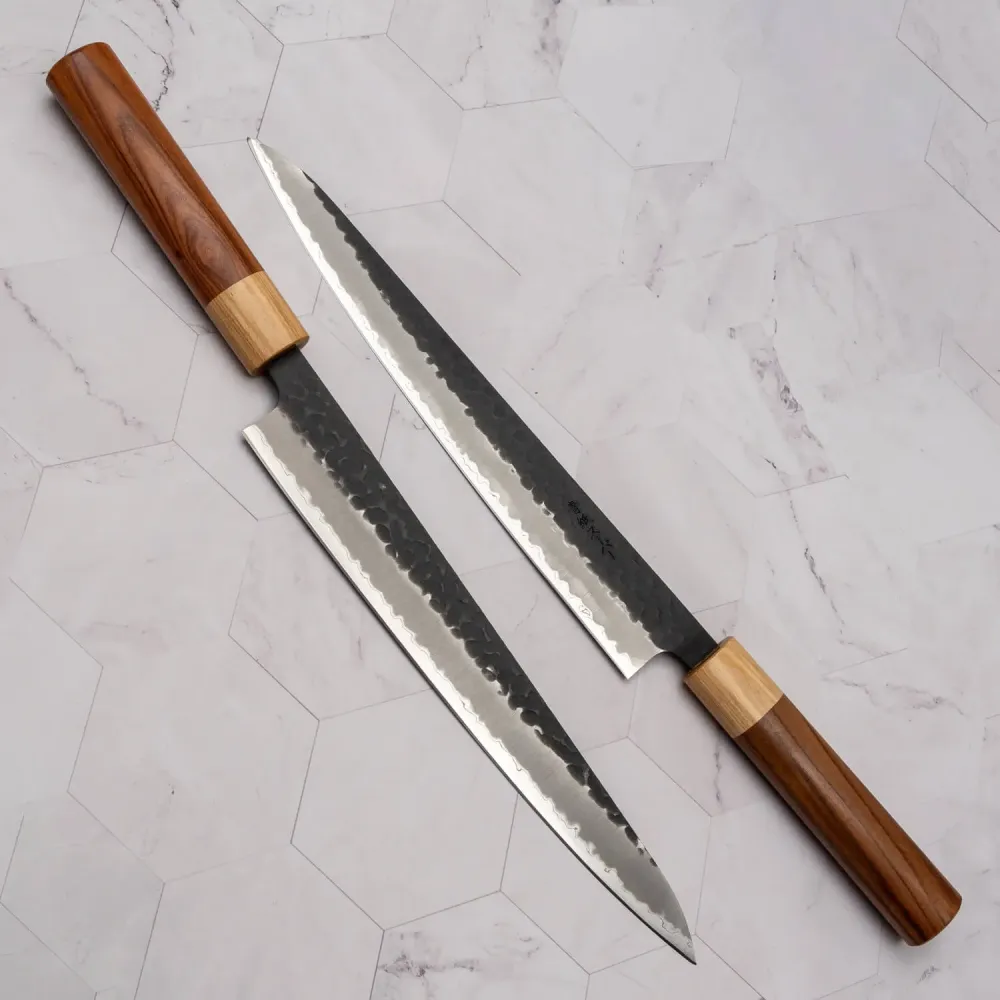 Das Kazoku Aogami Super Wa Sujihiki 24 cm ist die Spitze der Leistung für diejenigen, die das Beste an Schneidwerkzeugen verlangen. Gefertigt aus Aogami Blue Paper Super Steel, ist diese luxuriöse Variante der Aogami Serie für diejenigen gedacht, die extreme Schärfe und Langlebigkeit schätzen. Durch die Zugabe von Chrom, Wolfram und Kohlenstoff ist diese Klinge härter, hält ihre Schärfe länger und bleibt widerstandsfähiger als ihr Blue Paper #2 Gegenstück. Die dünne Klinge in Kombination mit der hervorragenden Härte von 63-64 HRC sorgt dafür, dass sie mit unvergleichlicher Präzision durch Fleisch, Sashimi und Sushi schneidet.