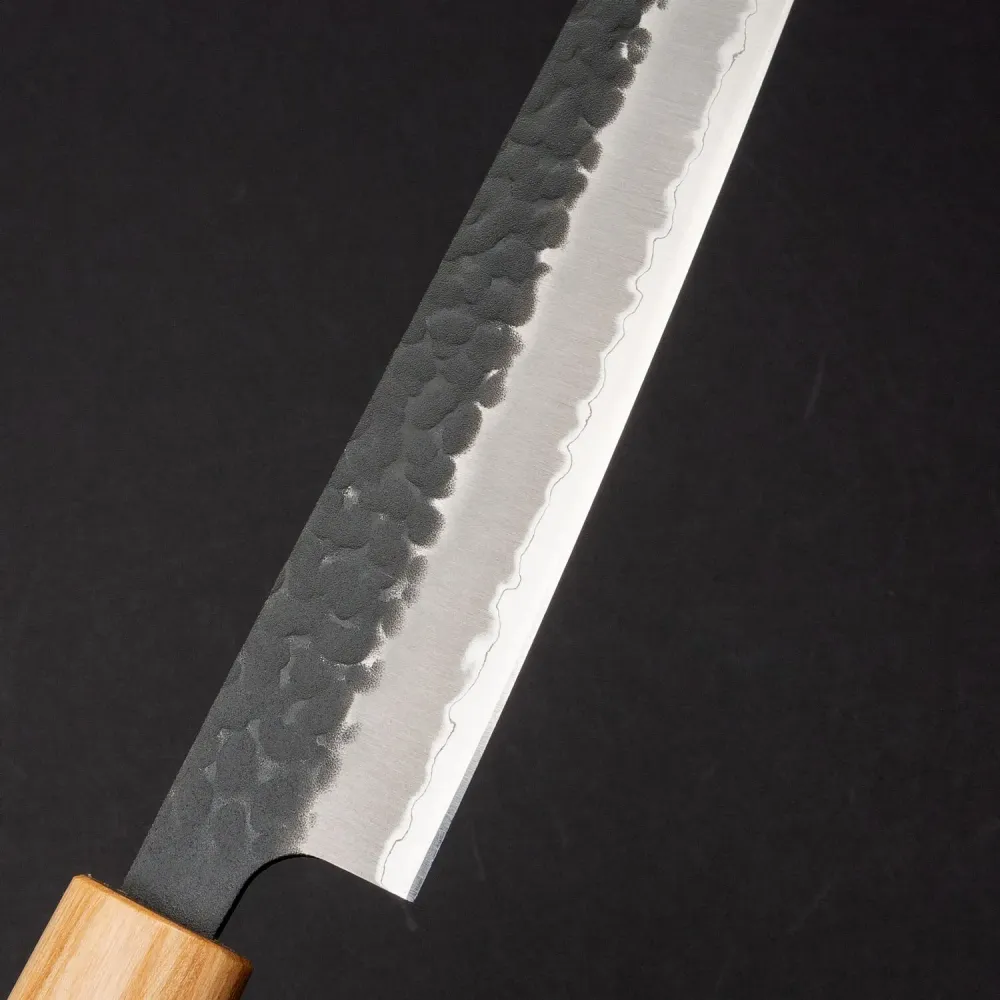 Der Kern der Klinge ist aus Aogami Blue Paper Super Steel geschmiedet und bietet eine außergewöhnlich harte und scharfe Schneide, die auch über einen längeren Zeitraum rasiermesserscharf bleibt. Die Klinge ist von zwei Lagen rostfreiem Stahl mit einem Kurouchi-Finish umhüllt, einer schwarzen Schmiedehaut, die die Haltbarkeit und Rostbeständigkeit erhöht. Zusätzlich ist die Klinge mit einem Tsuchime-Finish (gehämmert) versehen, das das Anhaften von Lebensmitteln während des Gebrauchs verhindert und ein sanfteres Schneiden ermöglicht.