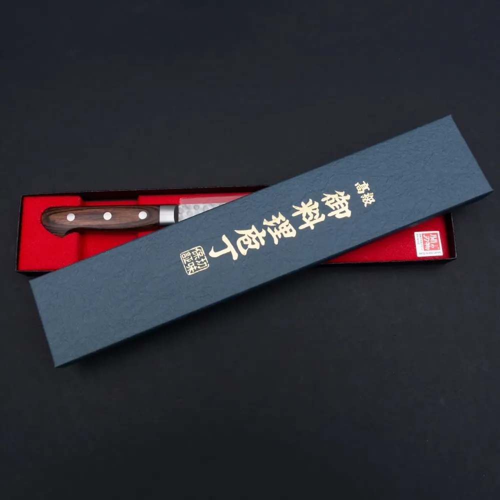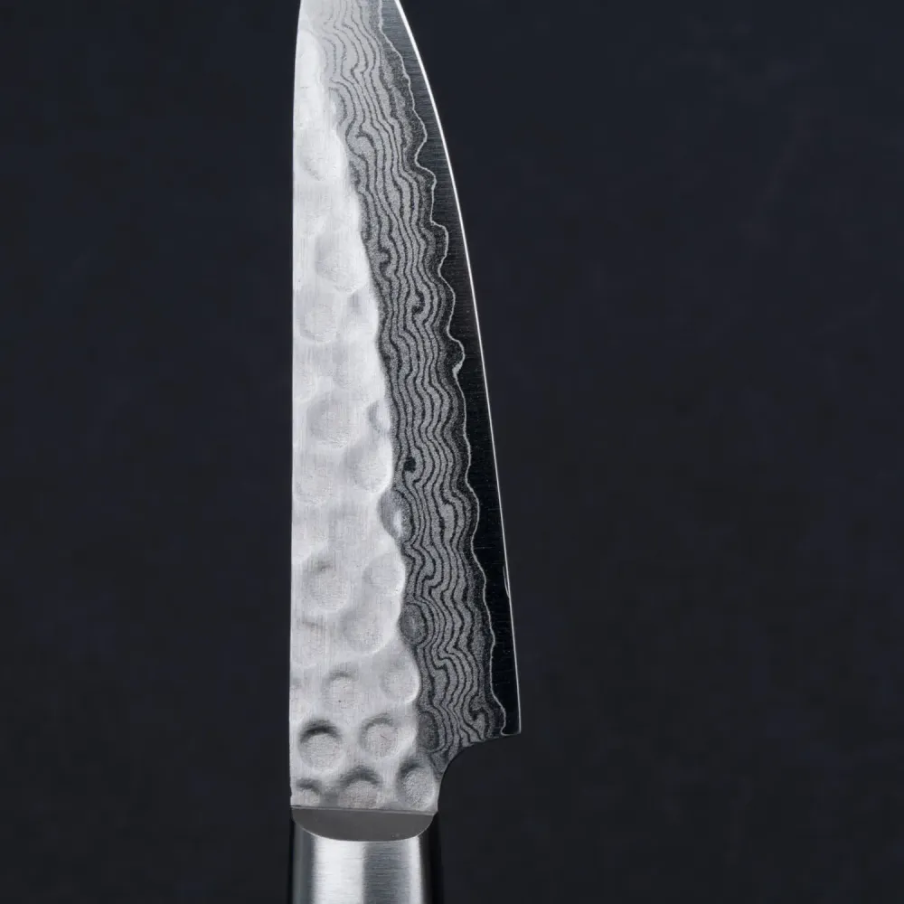 - Tsuchime-Finish: Das gehämmerte Muster reduziert das Anhaften von Lebensmitteln und verleiht dem Messer ein unverwechselbares Aussehen.