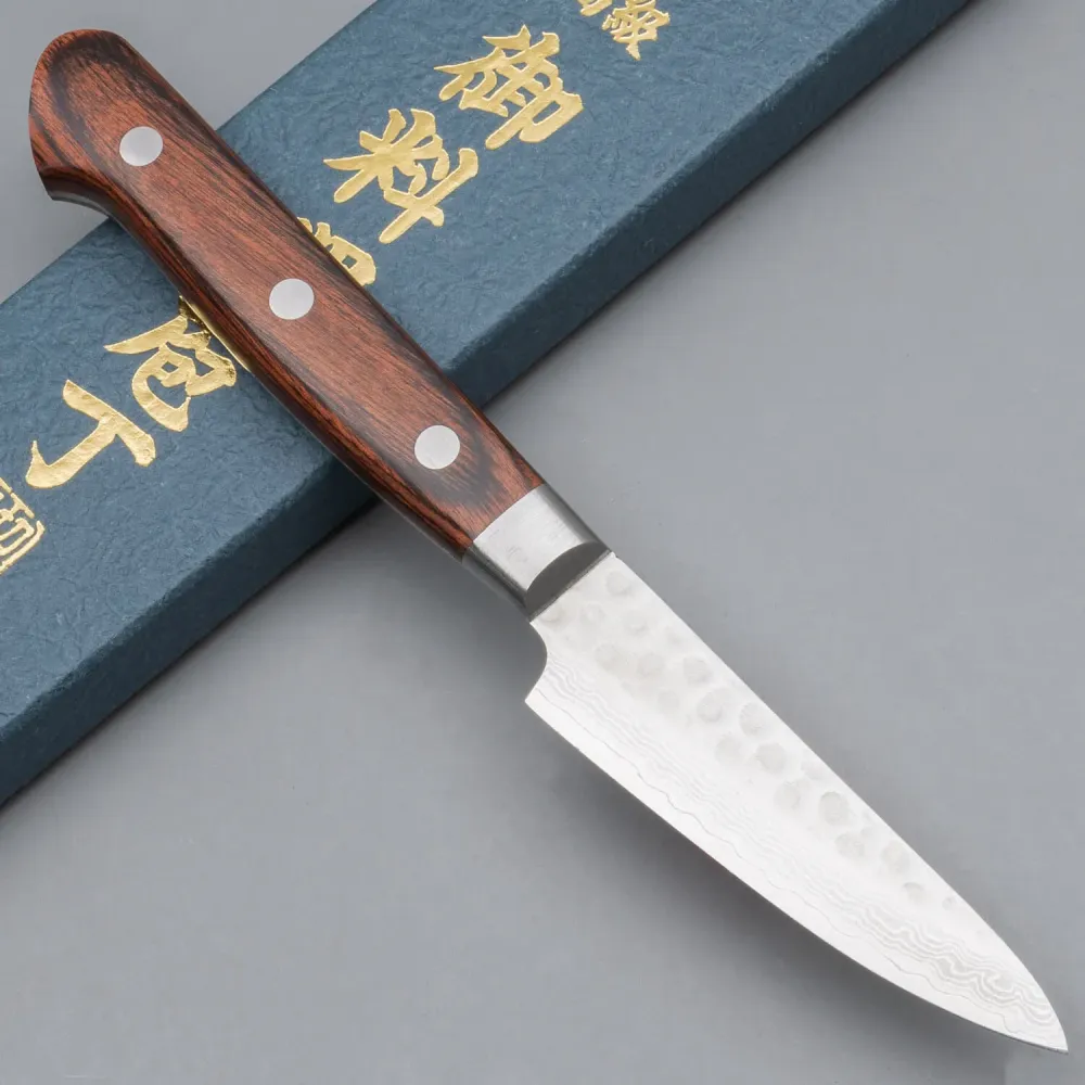 Die Klinge ist mit mehreren Lagen Damaszenerstahl verstärkt, die den harten VG-10-Kern schützen und die Haltbarkeit des Messers erhöhen. Die traditionelle Tsuchime-Beschichtung (gehämmert) verleiht dem Messer nicht nur einen einzigartigen Charakter, sondern verringert auch das Anhaften von Lebensmitteln beim Schneiden. Der Griff ist aus hochwertigem braunem Pakkaholz gefertigt, das die Wärme des Holzes mit der Strapazierfähigkeit von Kunststoff kombiniert und einen komfortablen und pflegeleichten Griff bietet.
