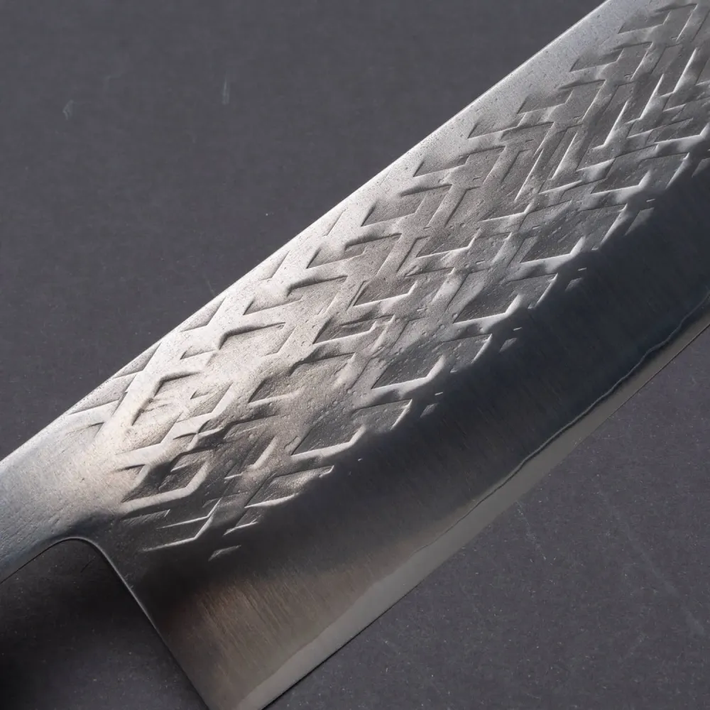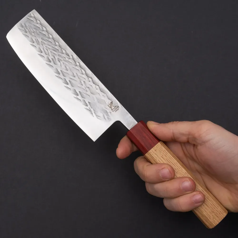 Kazoku’s innovative approach to hammering the steel adds both function and artistry to the Nakiri knife. This special hammer blow processing helps reduce food sticking to the blade, allowing for smoother and more efficient cutting, making it ideal for slicing through vegetables with ease.