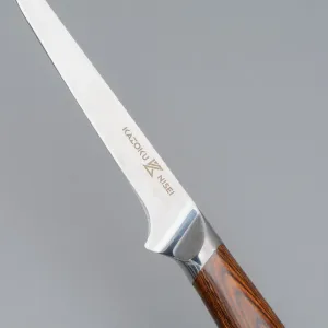 A class of high-quality knives at a friendly price, the Kazoku Nisei sports high-quality German molybdenum vanadium steel blades, the type of steel used by French and German brands. Includes paring knives, a fillet knife, a meat carving knife, a chef's knife, bread knife, and a boning knife. Comes with finished pakka wooden handles.