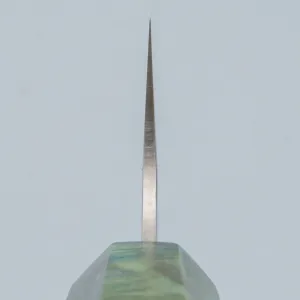The Kazoku Uteki Burlwood Green Petty features a 15 cm blade made from high-performance VG10 stainless steel—widely respected for its purity, edge retention, and corrosion resistance. With a Rockwell hardness of 60–61 HRC and sharpened to a razor-sharp 15° edge, this petty knife is built for precision: whether peeling fruit, trimming meat, or performing intricate cuts. The blade’s thin profile and Tsuchime (hammered) finish enhance food release and lend a handcrafted character to the design.