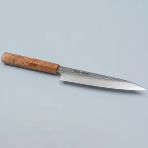 The tapered octagonal handle, made of beautiful burlwood, offers both comfort and control. Lightweight yet sturdy, the Uteki Petty is an essential companion for chefs who demand finesse in their cutting tools.
