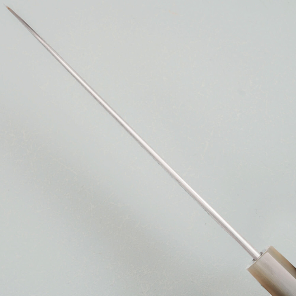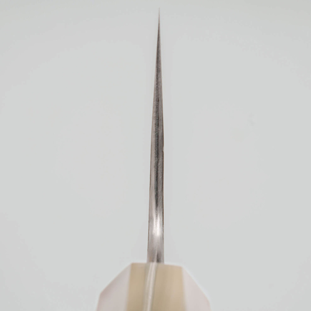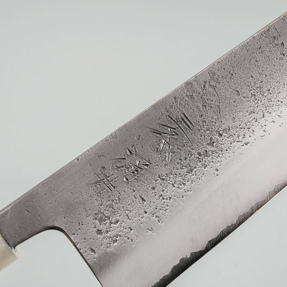 The blade is made from Shirogami #2 carbon steel, known for its exceptional sharpness and ease of sharpening. Through refined heat treatment, it achieves a hardness of 62–63 HRC. The stainless cladding protects the core from rust, while the kurouchi finish provides a distinctive dark texture. The wide machi gives the knife a traditional look and helps maintain optimal balance during cutting.