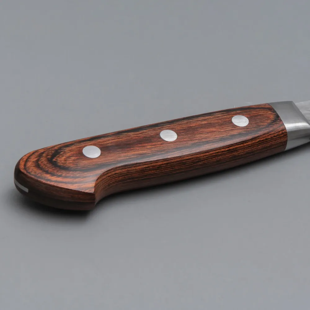 Dit mes is gemaakt van Zweeds Sandvik 19C27 roestvrij staal en is gemaakt om lang mee te gaan, met uitstekende randscherpte en weerstand tegen corrosie. Het staal is gehard tot 59-60 HRC, wat zorgt voor een scherpe, duurzame snede die zijn prestaties behoudt, zelfs bij regelmatig gebruik. Het Pakka houten handvat biedt een comfortabele en stevige grip en zorgt voor een perfecte balans en controle tijdens het je werk. Het ergonomische ontwerp zorgt voor een gemakkelijke hantering, zelfs tijdens lange snijsessies, terwijl het slanke uiterlijk een elegante touch aan het mes toevoegt.