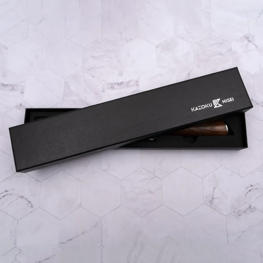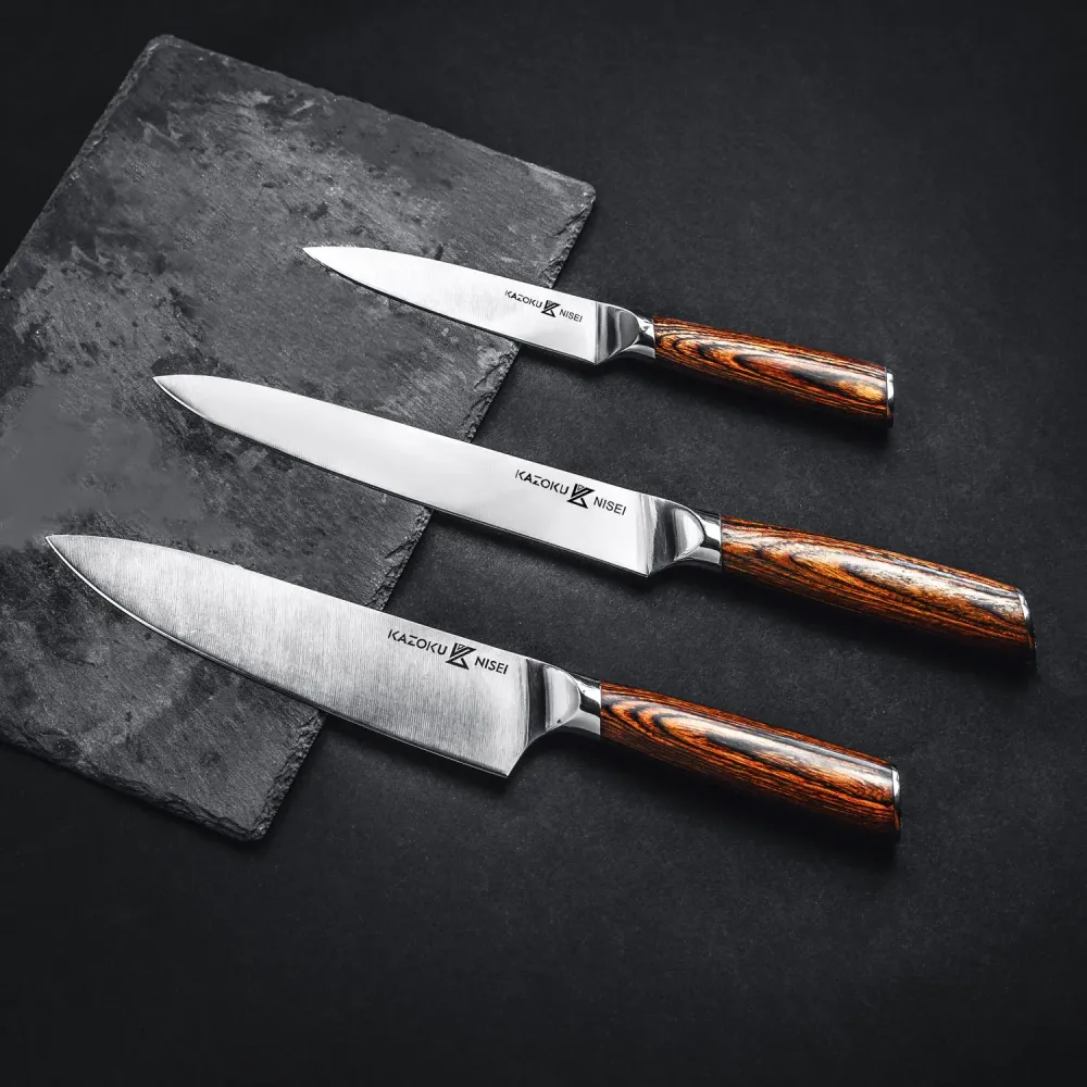 Deze messen zijn gemaakt van Duits molybdeen-vanadiumstaal van topkwaliteit en staan bekend om hun scherpte en duurzaamheid, terwijl ze ook makkelijk te onderhouden zijn. Een paar keer slijpen met een aanzetstaal zorgt ervoor dat ze soepel blijven snijden. De pakkahouten handgrepen van de messen zijn ontworpen voor comfort en controle en bieden een meer verfijnde en elegante afwerking in vergelijking met kunststof messen. Als je je op zoek bent naar een betrouwbare, budgetvriendelijke messenset die prachtig presteert, dan is de Kazoku Nisei 3-delige set de perfecte keuze.