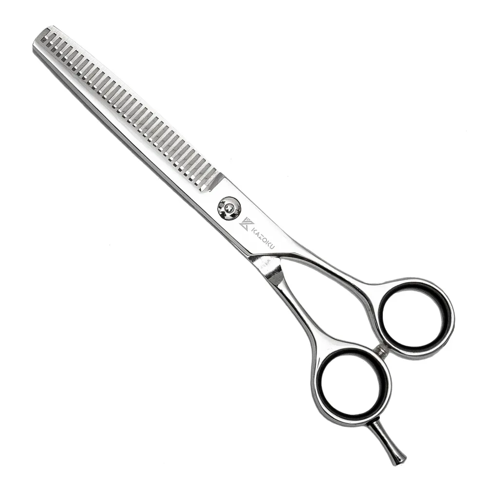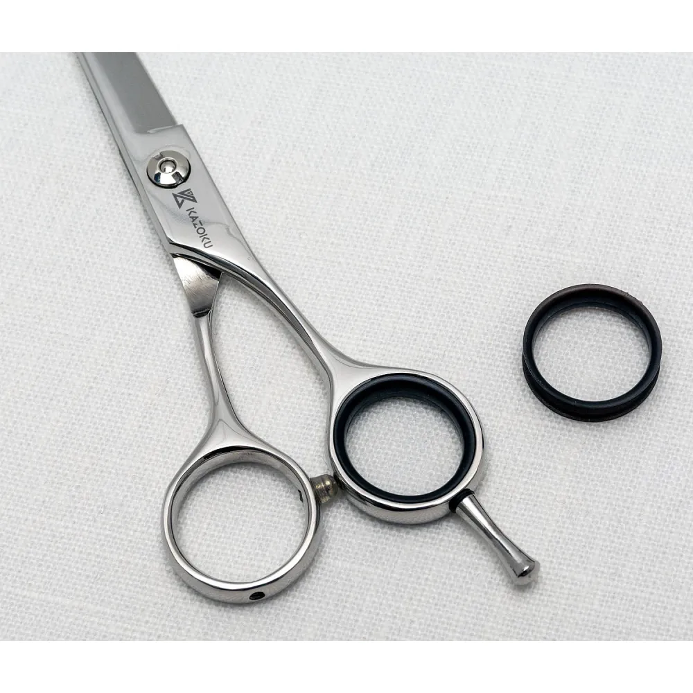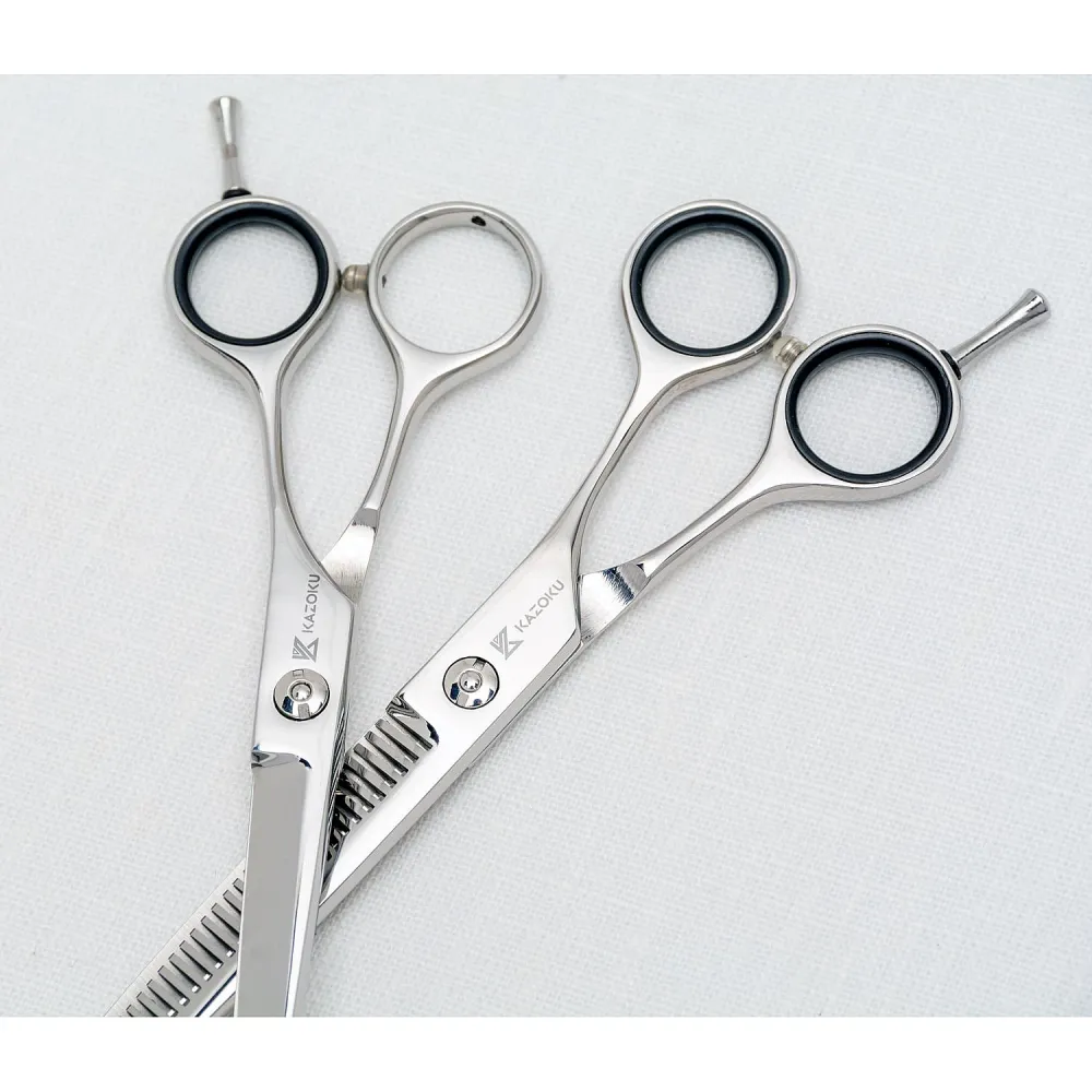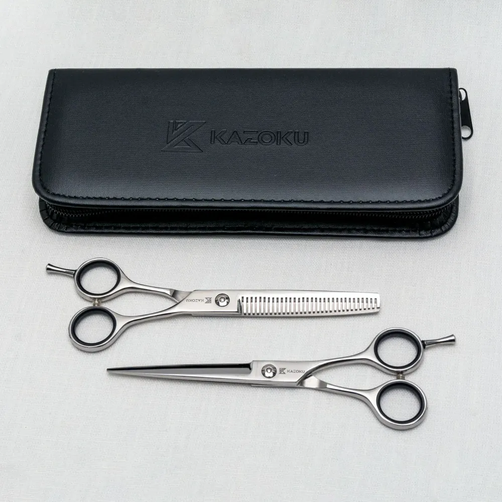 De Kazoku Kappersschaar Set 6 Inch biedt alles wat je nodig heeft om thuis of in de salon een vlekkeloos kapsel te krijgen, en dat alles voor een scherpe prijs. Deze scharen zijn gemaakt van hoogwaardig Duits staal met een Rockwell-hardheid van 56, van hetzelfde duurzame materiaal dat wordt gebruikt in professionele messen van gerenommeerde Duitse merken. Dit eersteklas staal maakt convex slijpen mogelijk, waardoor de schaar uitzonderlijk scherp is en soepel knipt - moeiteloos glijdend door zowel dun als dik haar.