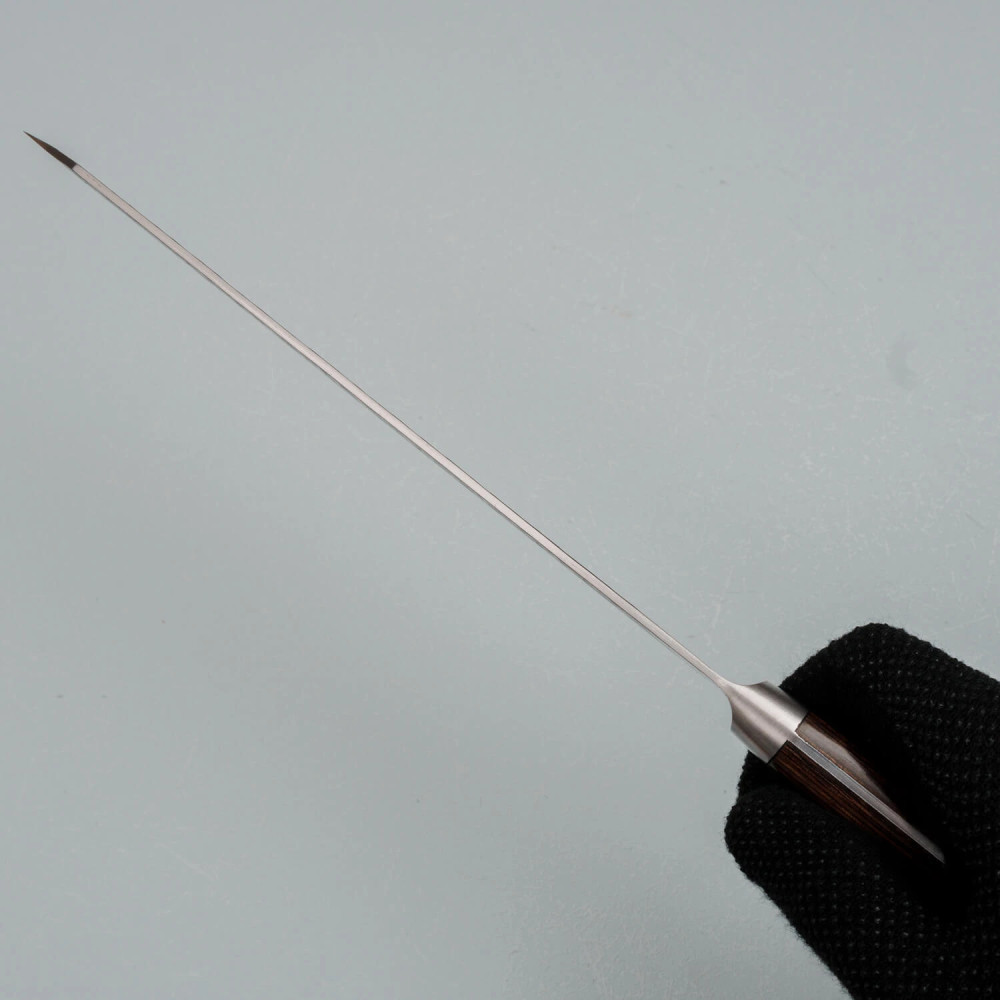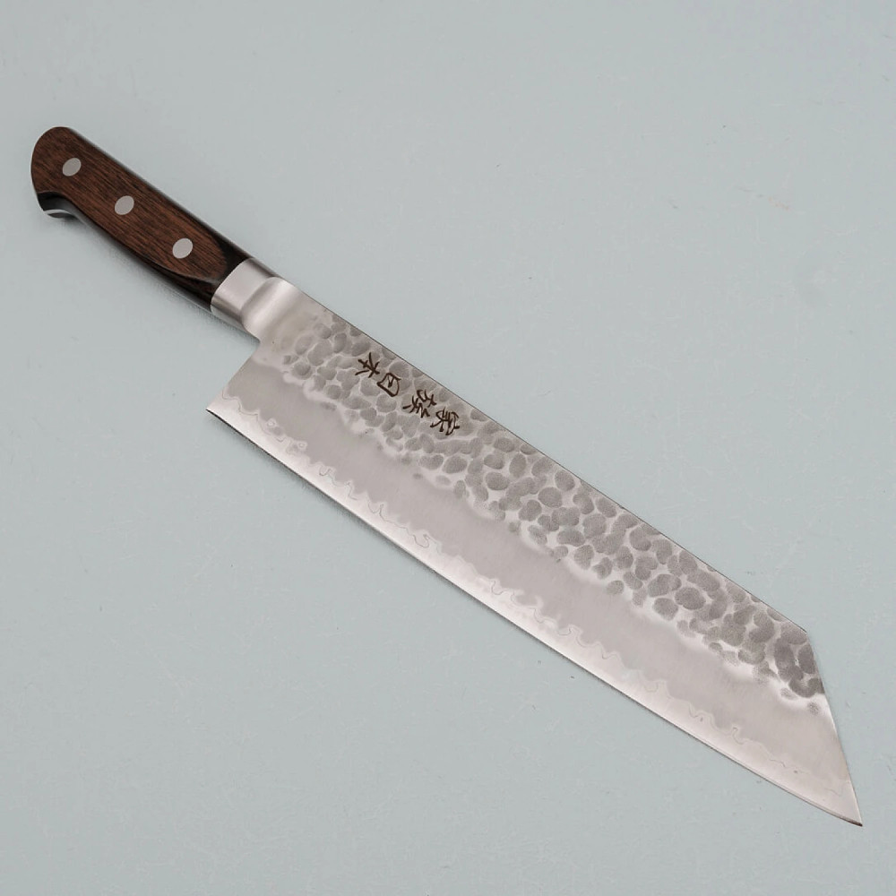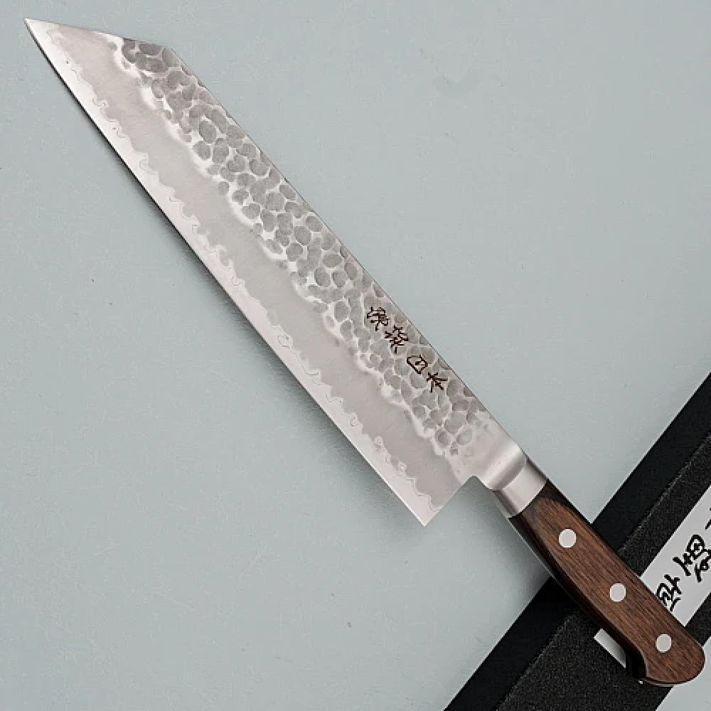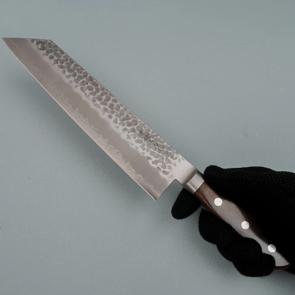 De kern van het lemmet is gemaakt van Aogami Blue Paper Super staal, een hoogwaardige legering verrijkt met chroom, wolfraam en koolstof, waardoor het uitzonderlijk hard en taai is. De buitenste lagen zijn van roestvrij staal met een kurouchi afwerking voor extra bescherming en een rustieke esthetiek. De tsuchime gehamerde textuur helpt het voedsel los te laten tijdens het snijden.