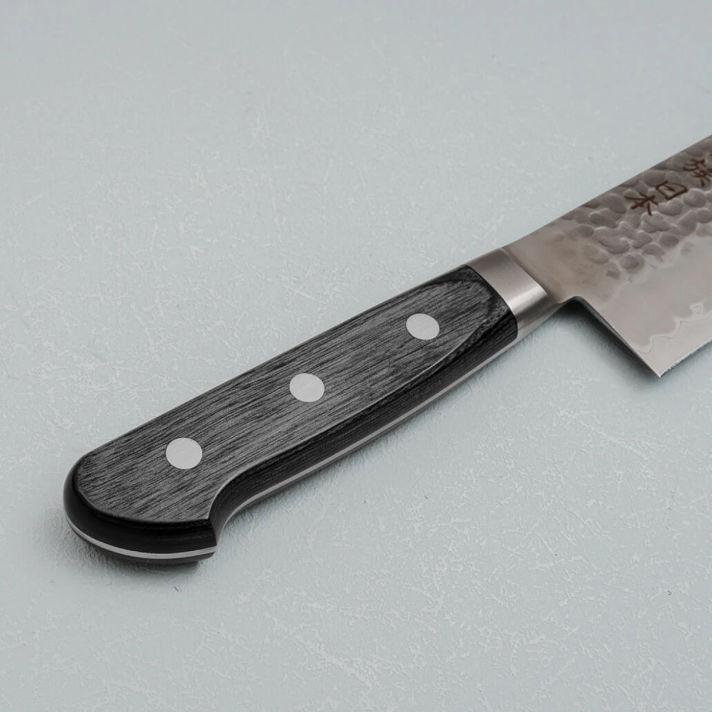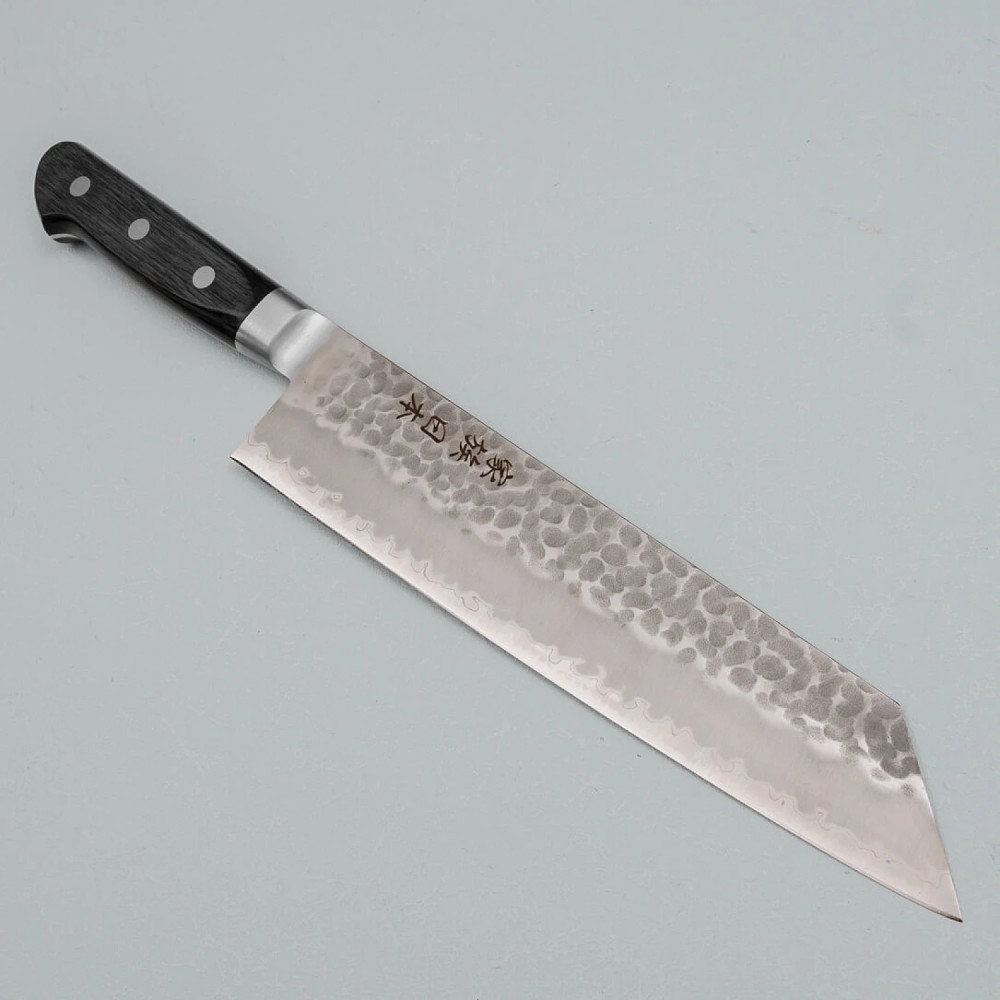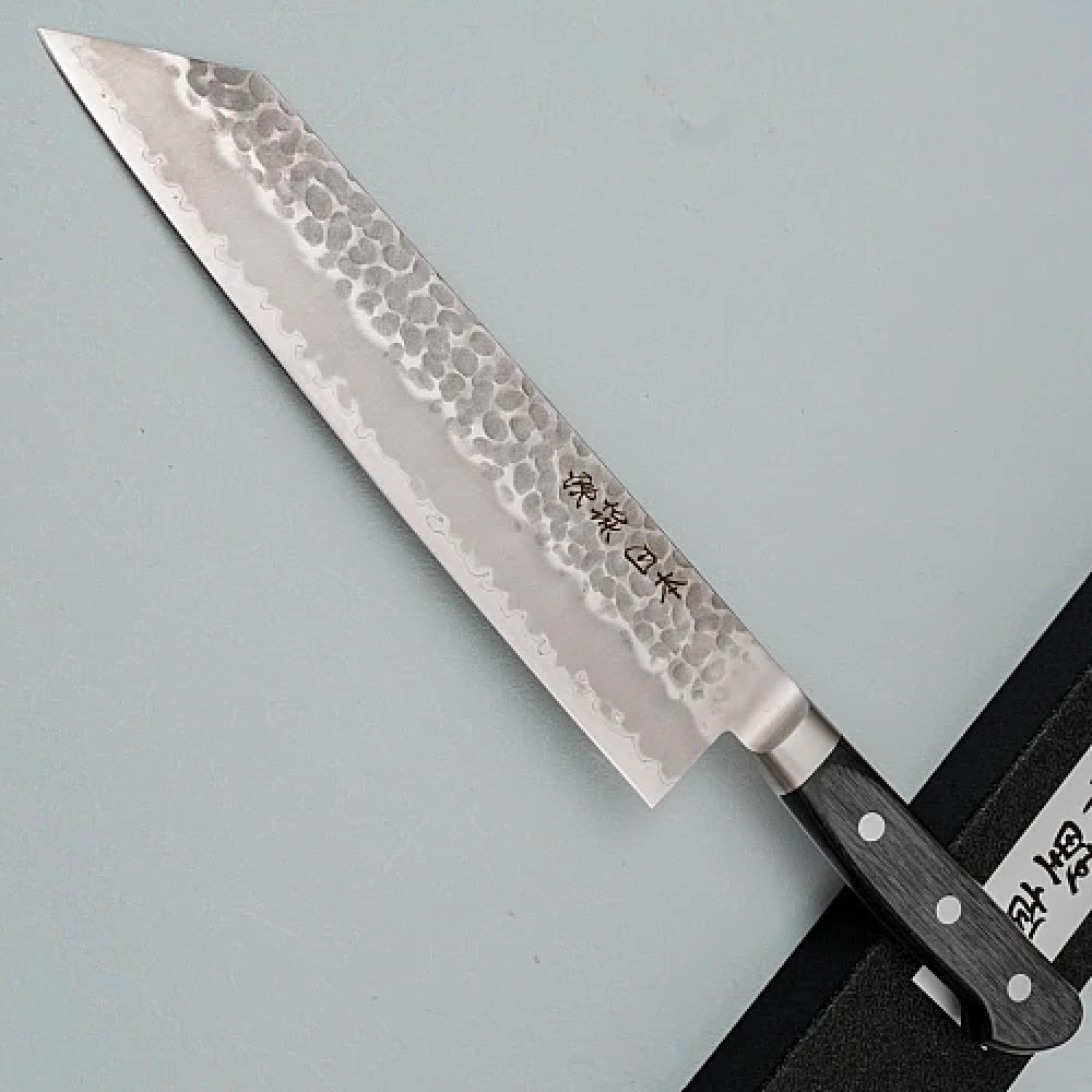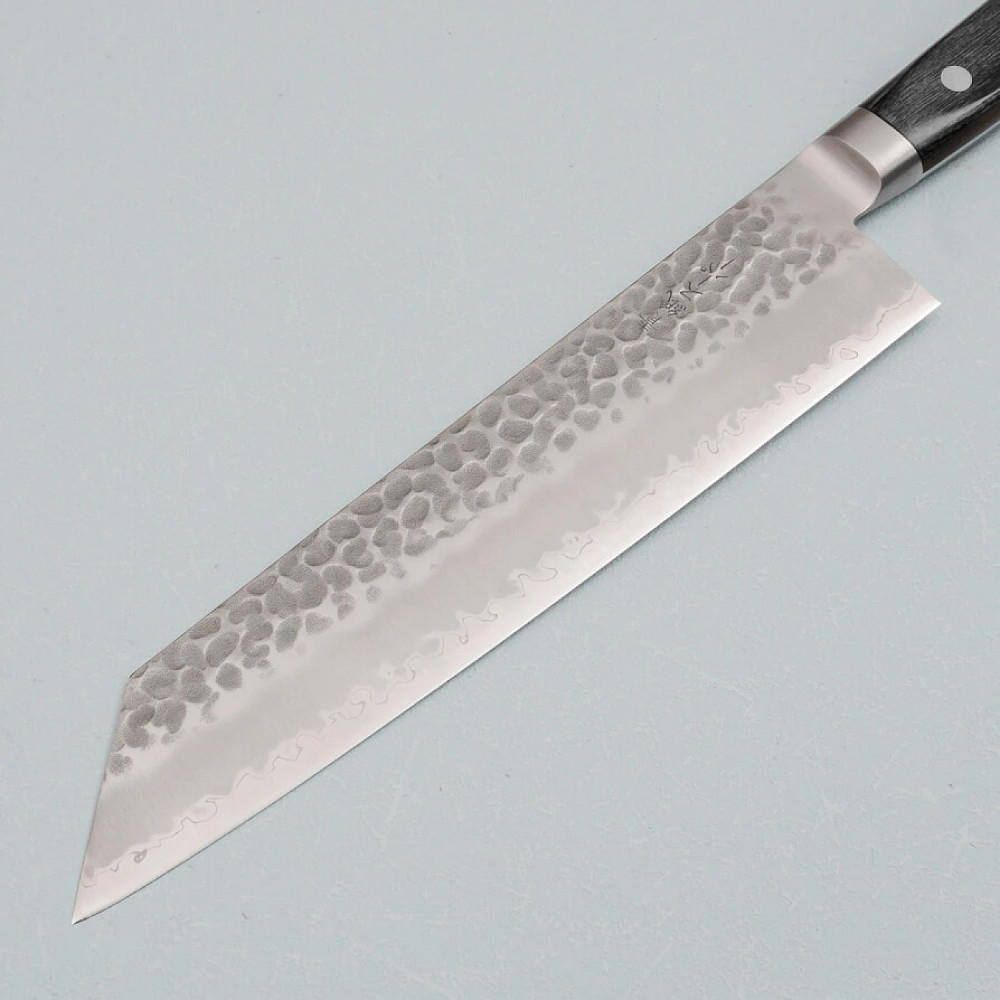De kern van het lemmet is gemaakt van Aogami Blue Paper Super staal, een hoogwaardige staallegering verrijkt met elementen zoals chroom en wolfraam, waardoor het een uitzonderlijke hardheid en snijcapaciteit heeft. De kern is bekleed met roestvrij staal met een kurouchi afwerking, wat zorgt voor sterkte, bescherming en een traditionele esthetiek. Een tsuchime gehamerde afwerking helpt verder voorkomen dat voedsel aan het lemmet blijft plakken.