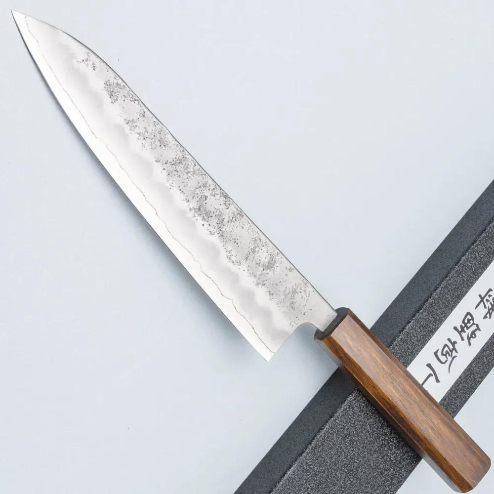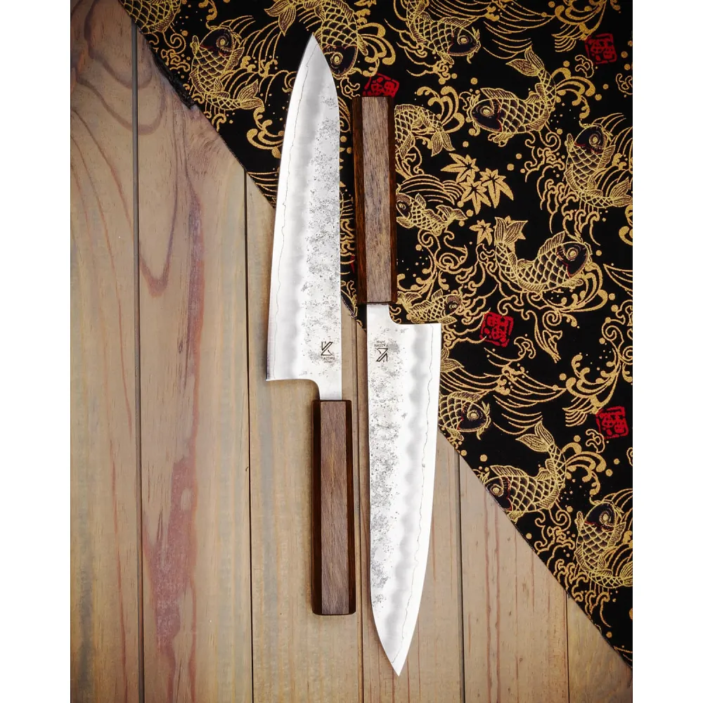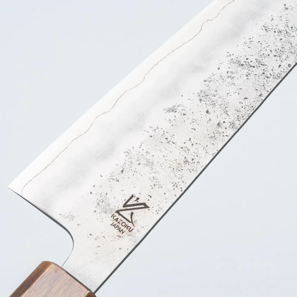 Een professionele kok moet een instrument hebben dat zijn vaardigheden bijhoudt, zoals dit Kazoku Ginsan Nashiji Gyuto Japanse mes. Dit koksmes heeft een roestvrijstalen lemmet van 21 cm voor het snijden van vlees, groenten en vis. Je zult dol zijn op de gelamineerde 'Sanmai' constructie met een unieke 'Nashiji' afwerking.