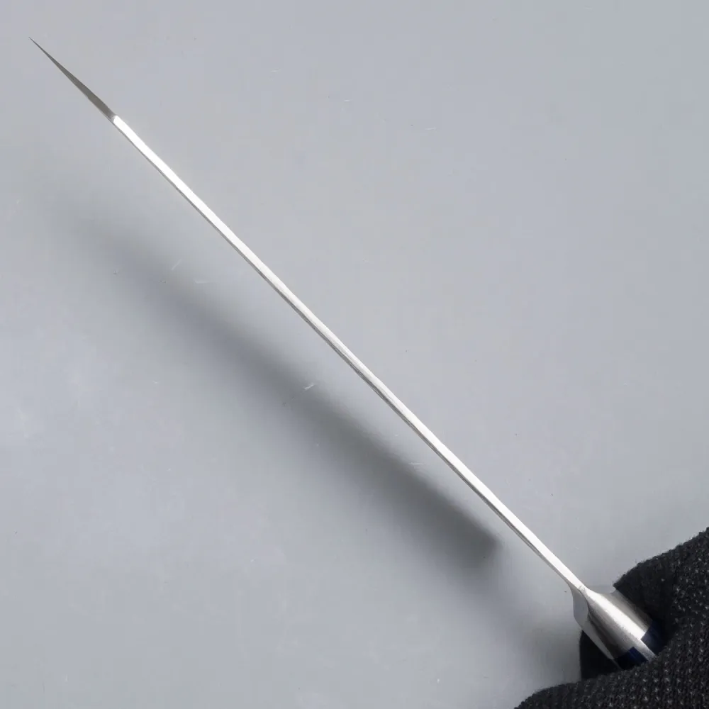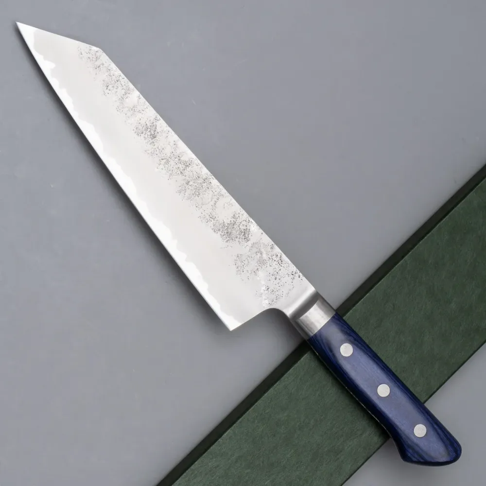 Het handvat van de Kazoku Kiritsuke is gemaakt van koningsblauw Pakka hout, een combinatie van hout en kunststof die zowel de warme esthetiek van natuurlijk hout als de onderhoudsvriendelijkheid van synthetische materialen biedt. Dit duurzame materiaal zorgt voor een stevige en comfortabele grip en voegt tegelijkertijd een vleugje verfijning toe aan het algehele ontwerp van het mes. De unieke koningsblauwe kleur versterkt de visuele aantrekkingskracht van het mes, waardoor het niet alleen een functioneel stuk gereedschap is, maar ook een waar kunstwerk.