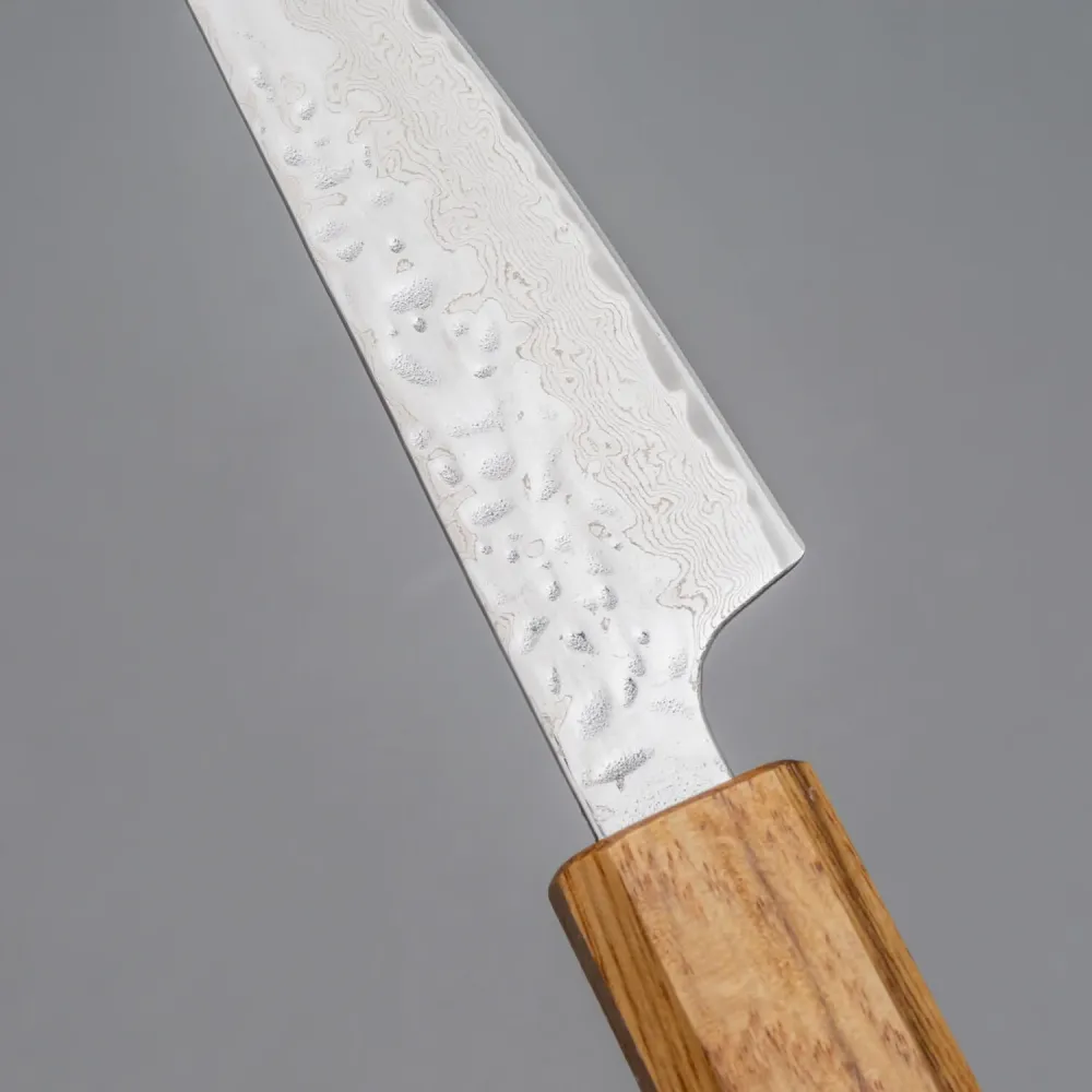Gemaakt van premium Japans AUS 10 staal met een hardheid van 61 HRC, combineert dit mes uitzonderlijke scherpte en duurzaamheid. Het staal is omhuld door 16 lagen roestvrij staal, waardoor een aantrekkelijk lijnenspel ontstaat dat het mes visueel aantrekkelijker maakt. De gehamerde afwerking vermindert wrijving en zorgt ervoor dat voedsel minder blijft plakken tijdens het snijden, waardoor het een ideaal gereedschap is voor nauwkeurig en soepel snijden. Zoals alle Kazoku messen is ook dit mes met trots gemaakt in Seki, Japan, een stad die bekend staat om zijn messenmakerstraditie.