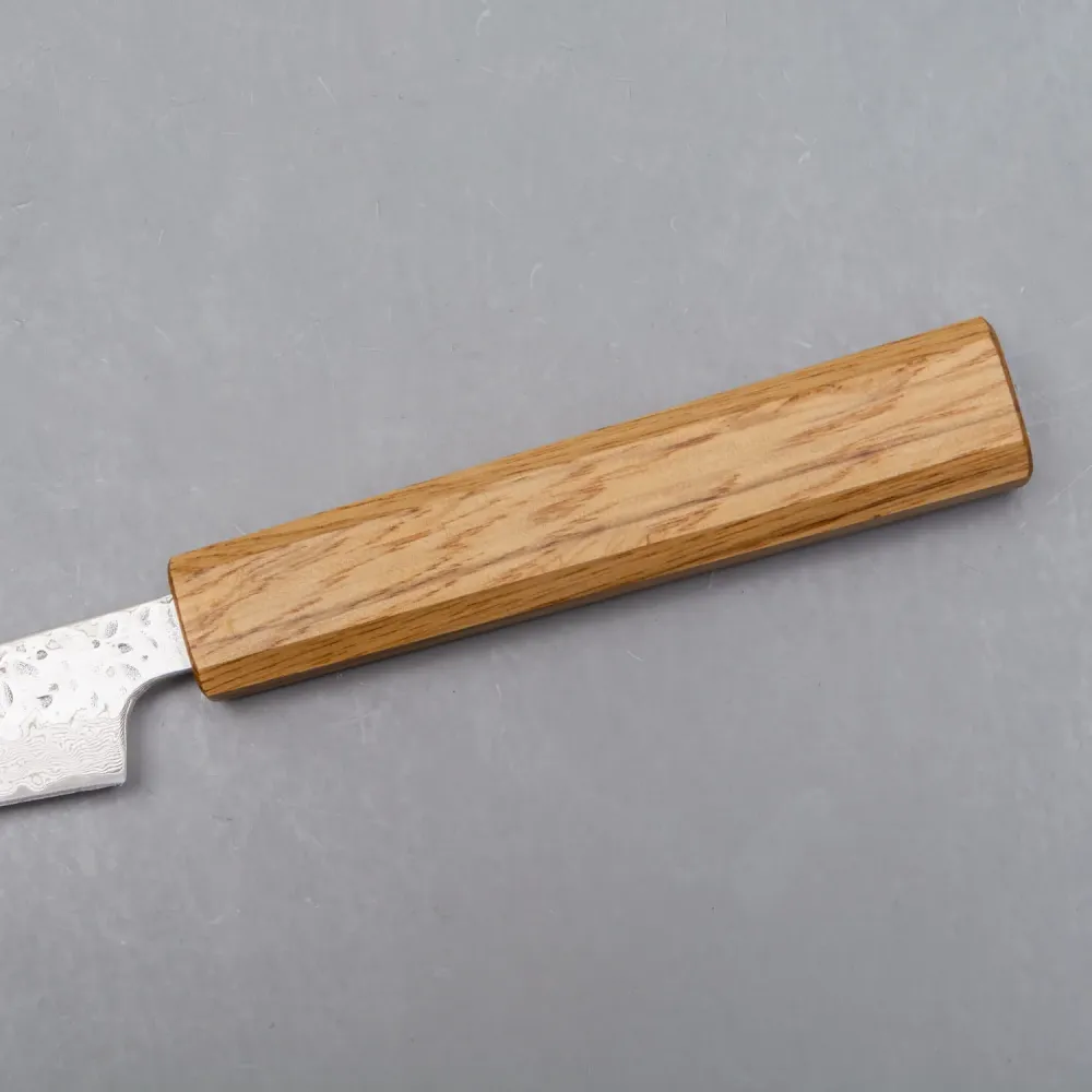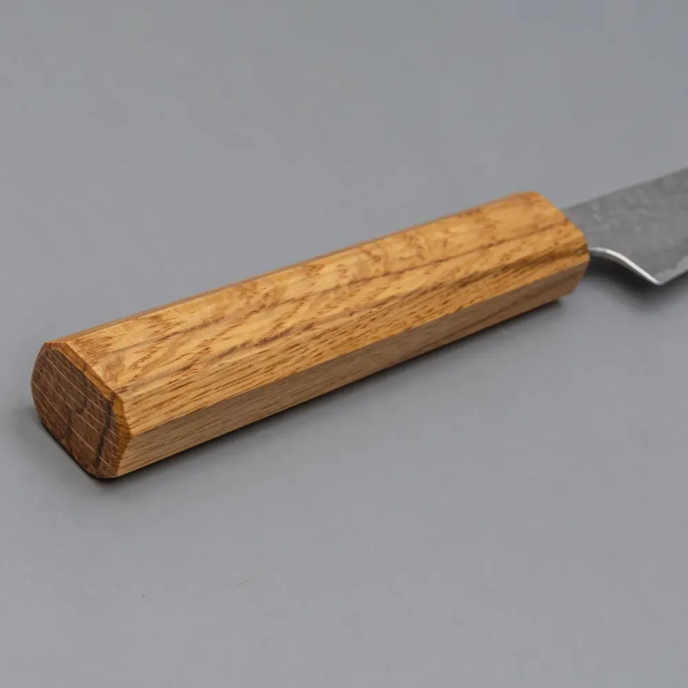 Het achthoekige handvat is gemaakt van Enju, een Japans hardhout dat bekend staat om zijn vochtbestendigheid en onderhoudsvriendelijke eigenschappen. De ergonomische vorm zorgt voor een stevige en comfortabele grip, zelfs als jouw de handen nat zijn. Bij regelmatig onderhoud, inclusief af en toe invetten, krijgt het handvat na verloop van tijd natuurlijker karakter, waardoor de luxe uitstraling van het mes nog groter wordt.