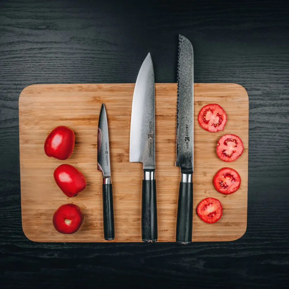 This set combines versatility with control. The Santoku works as your main all-round knife, the petty handles detail work, and the bread knife takes care of crusty bread and soft produce. It’s a balanced combination for cooks who prefer a slightly more compact main knife.
