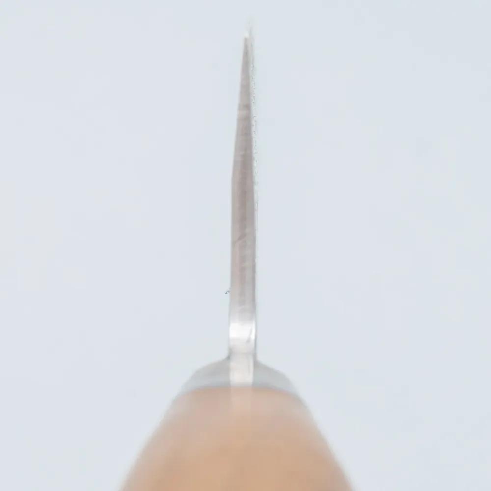 The Kazoku Mayonaka Gyuto is the ultimate knife for professional chefs and home cooks who demand precision and exceptional performance. Crafted from Aogami #2 carbon steel, this knife delivers outstanding sharpness and is easy to maintain. The blade is protected by two layers of stainless steel, providing enhanced durability and rust resistance. Its sloping distal taper design allows for fine, precise cuts, reducing the risk of breakage while ensuring smooth, effortless slicing.