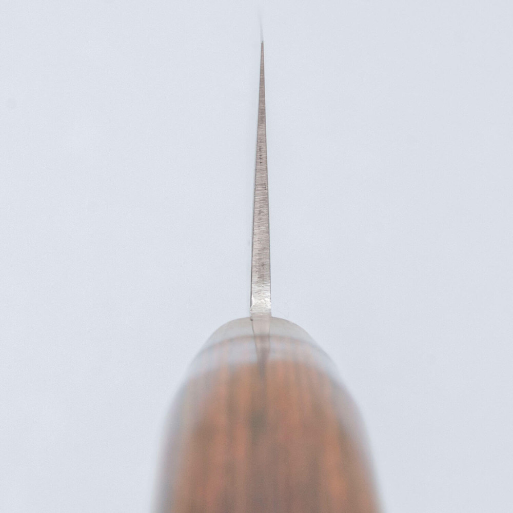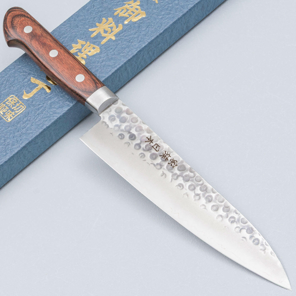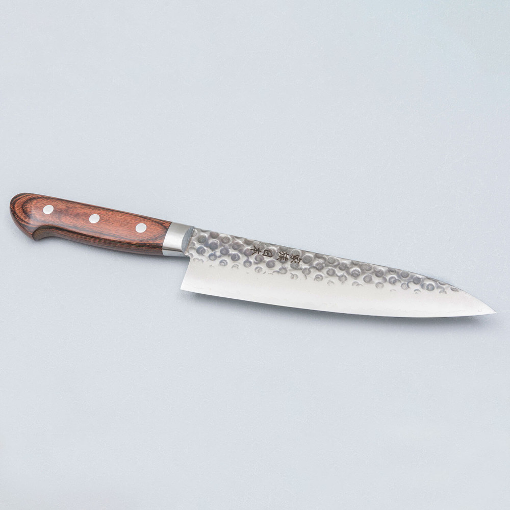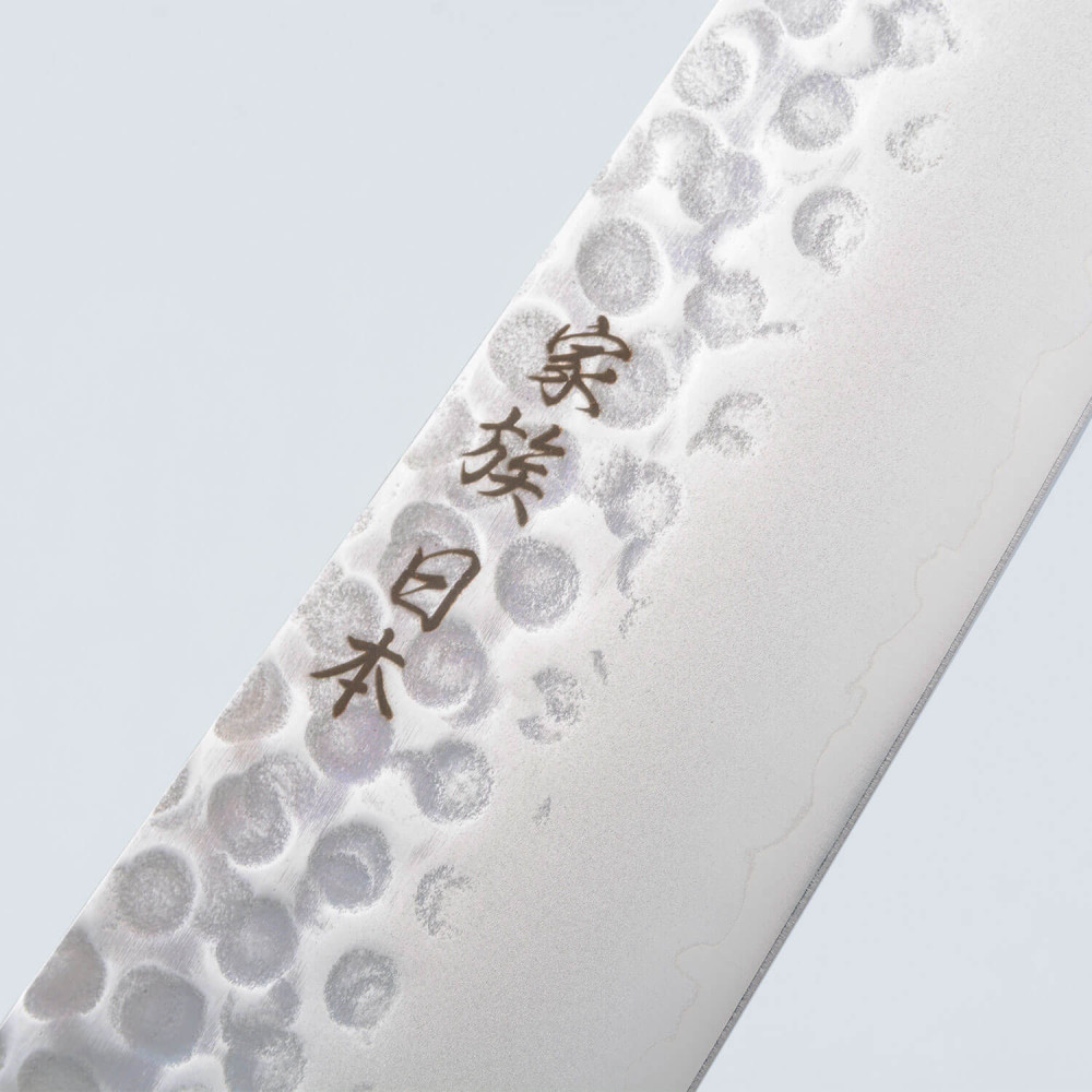 As a final touch, the blade features the traditional tsuchime (hammered) finish. This process not only creates a beautiful textured pattern on the blade but also helps reduce friction, making the knife easier to use and preventing food from sticking.