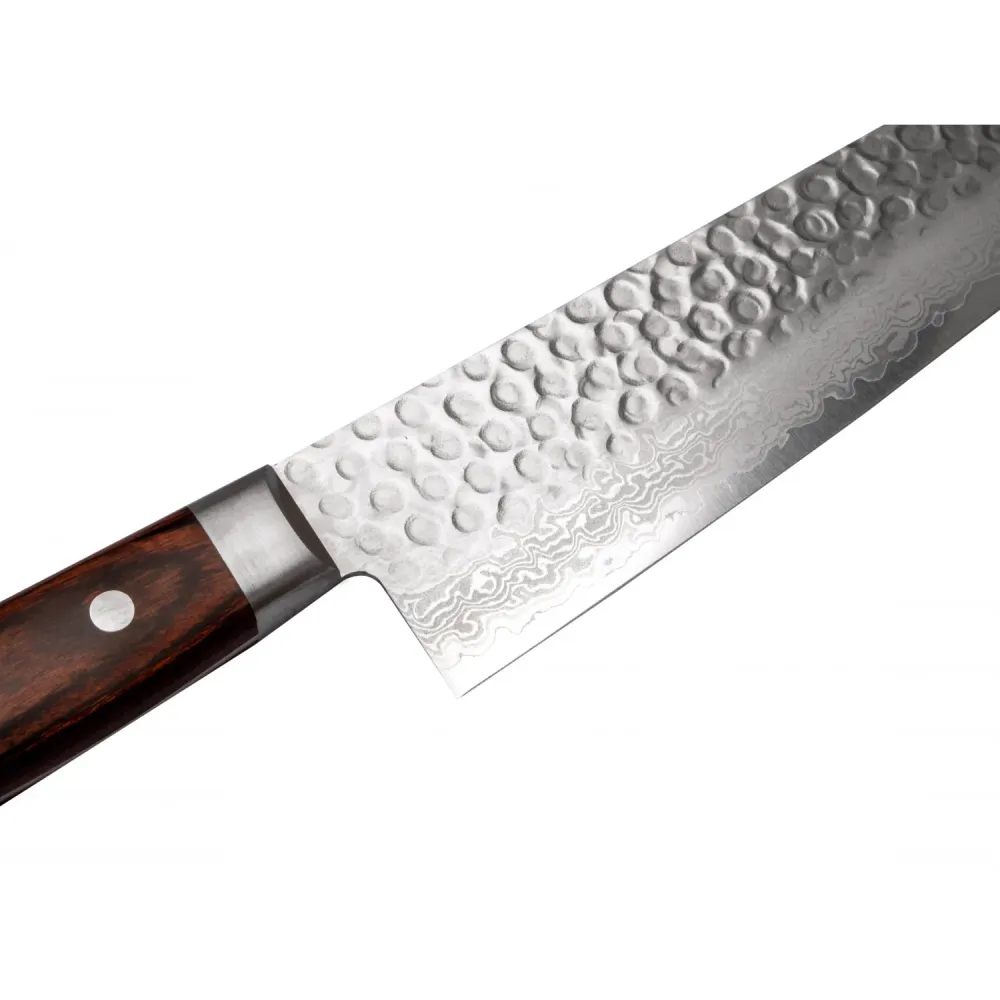 Crafted from VG-10 Japanese steel, both knives are known for their sharpness, durability, and edge retention. VG-10 steel provides a hard, long-lasting edge that can be sharpened to an ultra-fine point for precision cutting. The blades are reinforced with multiple layers of Damascus steel for added strength and resilience. The tsuchime (hand-hammered) finish not only enhances the knives' visual appeal but also helps reduce food sticking during use. The brown pakka wood handles combine the warmth of natural wood with the durability of plastic, ensuring comfort and ease with every cut.