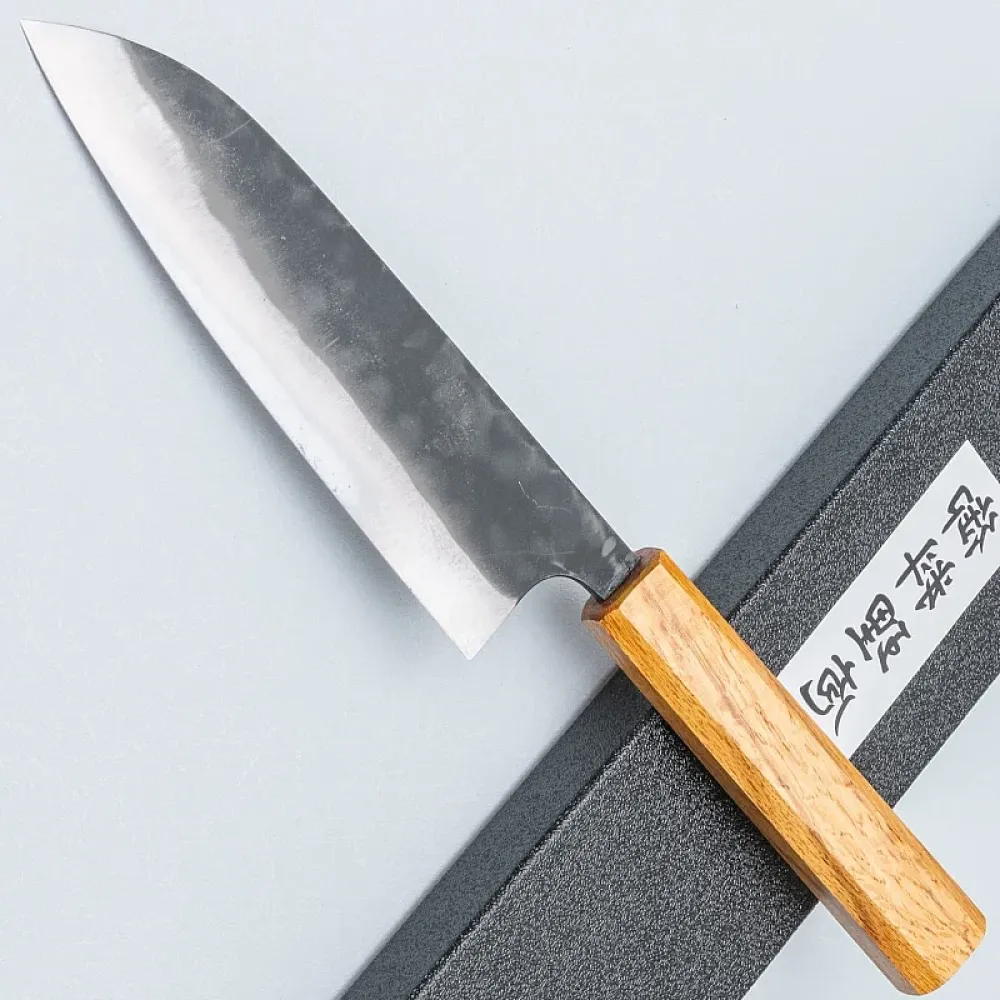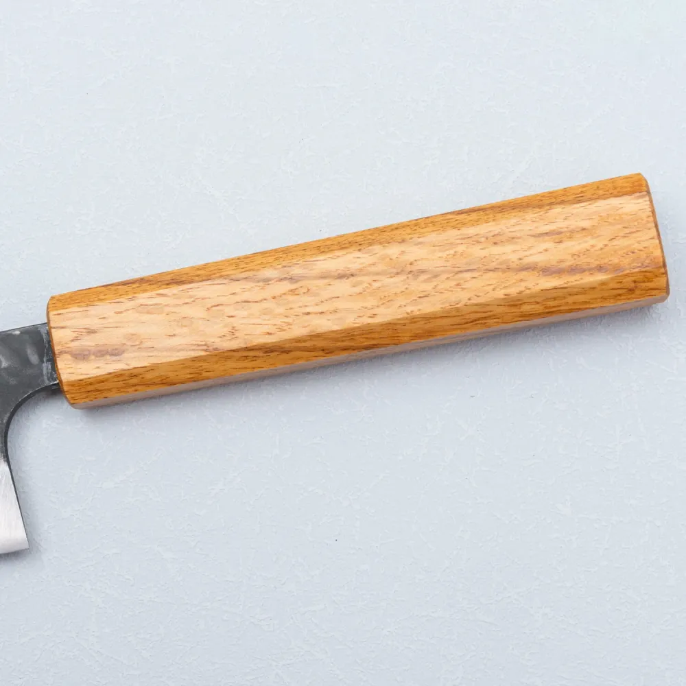 The knife’s blade features a striking dark kurouchi finish, which not only adds a sophisticated aesthetic but also offers practical protection against oxidation, ensuring the blade remains resistant to corrosion. The octagonal oak handle is ergonomically designed, providing a firm and comfortable grip that allows for superior control and ease of use during extended cutting tasks.